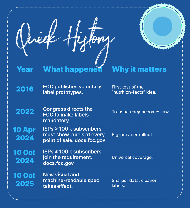 The FCC’s “Broadband Consumer Label” started appearing on ISP websites and in-store displays this year. By design, it works like a nutrition label—same look, same goal: give people the facts in one glance. But the rules don’t stop with the 2024 rollout. A second, more detailed specification kicks in on 10 October 2025 and every provider—large or small—has homework to finish first. Below is a straightforward rundown of what’s changing and why it matters.
